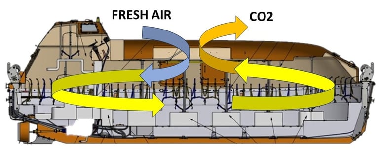 We made the it a smart system or you may named it as active system since the operation of the system determined by a CO2 sensors to captured real time CO2 level within the lifeboat. The onboard computer will make auto selection of fan speed and activation, in such way optimization the power consumption can be greatly achieved